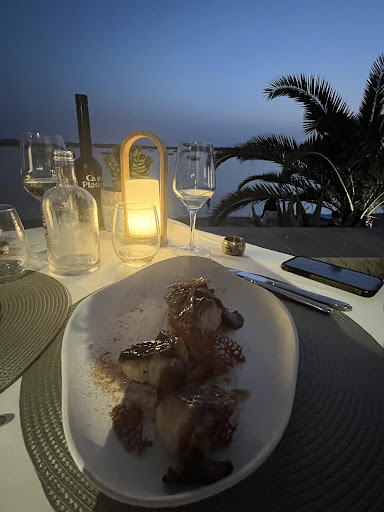 Quimera, located in La Savina right on the coast of the inner harbor, offers a stunning combination of modern decor and culinary innovation. With its sleek, contemporary style, the restaurant presents a refreshing twist both in its atmosphere and its dishes. We were fortunate to enjoy a company dinner with around 20 attendees, and the outdoor seating with a picturesque view of the harbor made the experience even more special.