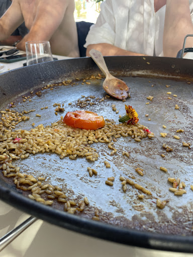 Decidimos no pedir entrante para no estar muy saciados cuando llegara el arroz y pedimos un pan y alioli para acompañar la cervecita. El pan es de tres variedades diferentes, todos buenos… el alioli… no llega para todo el pan… tampoco esperes olivas que suelen acompañar el alioli. Llega la paella… primera impresión…. bien decorada, perfecta para foto. Empezamos a rascar con la cuchara de madera que nos facilitan y la parte exterior sorprende por su extremado socarrat, llegando a ser molesto porque tiene un intenso sabor a quemado. La parte central tiene un ligero suquet que lo hace más meloso, decidimos remover toda la paella e integrar todas los sabores… se puede comer… pero no destaca ningún sabor a gamba y cigala que era la paella que habíamos pedido. Al amontonar todo el arroz percibes que son raciones muy escasas… teniendo en cuenta que los dos comensales somos de comer más bien poco. Llega el momento de probar las cuatro gambas y las dos cigalas que son lo único que acompaña el arroz. Tremenda decepción, es un producto congelado y demasiado cocinado. Nos quedamos con la sensación de que nos daban gato por liebre… Todas estas impresiones se las trasladamos a nuestra camarera y ella muy amablemente lo trasladó a cocina. En cocina, le dicen que se lo teníamos que haber dicho antes de haber acabado de comer, pero había hambre… nosotros no entendemos cómo sale de cocina una paella más quemada que socarrada…No íbamos a pedir postre. Pero como recompensa a nuestras quejas, tuvieron el detalle y nos invitaron a un postre, muy bueno por cierto. Era una torrija, pero no íbamos a comer un buen postre. Queríamos una paella de premio. Aun así,...