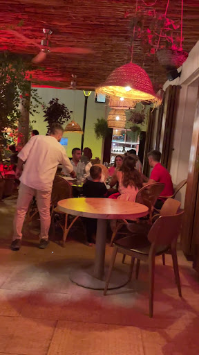 Exterior: una auténtica maravilla. Amplia, grande y parcialmente protegida de la lluvia o el viento. Llama mucho la atención las lámparas, la configuración de las mesas y sillas, el neón frontal y la ornamentación del techo. Una foodtrack es la barra donde se prepara la cocteleria. Mobiliario confortable y bien distribuido como en el interior.