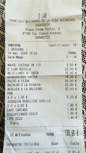 Read moreEste rte era un TOP para nosotros,en precio, atención y calidad. Tenemos casa en Foz,y disfrutamos de este sitio hasta su cambio. Hoy fuimos a comer el menú del día (en su momento,nos enamoramos de este sitio por la calidad de su menú del día,luego por su personal y después por la calidad de su producto de carta), para probar si seguían con la misma calidad y,¡ que decepción!. Tomamos una cerveza cada uno,que nos cobraron a precio diferente siendo la misma. Un primero de espárragos correosos, con 3rodajas de tomate, que juntas no hacían una, y dos lonchas de jamón serrano de blíster (de baja calidad, salado, gomoso). De segundo, una zorza con huevo y mucha grasa, muchísima grasa. Y una tarta helada de postre, que parecía mus por el tiempo que tardaron en servirla. El personal educado pero ninguno con nociones de hostelería/servicio atención al cliente. Una terraza, cuya ocupación no superaba el 25%, 4 camareros para atenderla y una mesa se levanta x estar esperando a ser atendidos más de media hora. Servir botellas de vino de carta abiertas en barra (o eso espero)y como eso más cosas. En Foz hay sitios increíbles para comer cálidad/atención/precio. Sintiéndolo mucho, no...