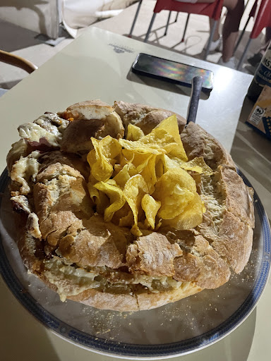 A pesar de la cantidad de mesas a las que atender, el camarero nos atendió perfectamente. La tapa fue salpicón, y además pedimos una rosca, que para nuestra sorpresa, era bastante grande y estaba muy rica. Éramos dos y nos costó comerla entera.