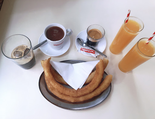 Price-wise: Pan con tomato + Churros + 2 coffee + 2 orange...