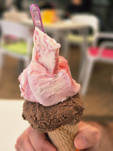 A very unpleasant female staff member at the ice cream counter. No smile, very unsympathetic, unhelpful, and cold attitude towards the customer. At the ice cream counter there are two women: you have to tell one of them which ice cream flavors you want, and she writes it down on paper. Then this woman handles the payment, while the other woman scoops the ice cream. I find this system absolutely unsuitable, because I told the first woman the order of flavors I wanted – chocolate, lemon, and vanilla – but the second woman changed the order and scooped the ice cream into the cone however she wanted.