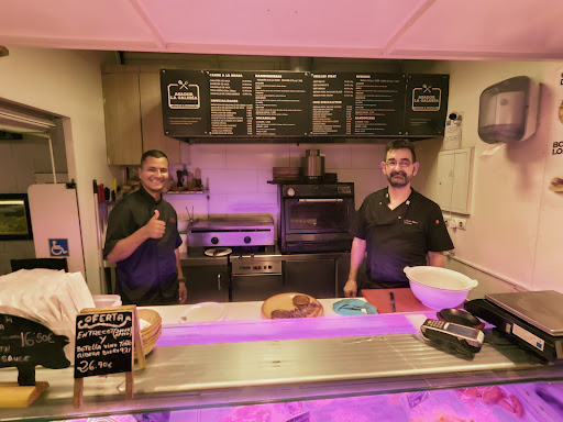 It's a great dining destination with a variety of eateries all conveniently located together. I typically avoid eating steak when I'm abroad because it usually doesn't match the quality of UK steak due to differences in cattle diet. However, at The Galleria, there's a steakhouse where I found the best steak in Spain. For €16.50, you can enjoy a delicious piece of steak served with chips and pepper sauce. The steak is charcoal-grilled in an oven, resulting in an unbelievable taste, while the homemade chips made from fresh potatoes are cooked perfectly. My son prefers the chicken nuggets from a different place within The Galleria, which is also his top choice. The staff throughout The Galleria are friendly and helpful. I highly recommend this spot and hope you enjoy it as much as I did. The 2 grill chefs...