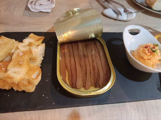 Read moreHa sido una comida espectacular,nos ubicamos en una mesa alta y estuvimos muy cómodos ya que las sillas tenían respaldo y eran bastante cómodas. Todos los platos que elegimos estaban muy bien elaborados y eran de calidad,la verdad que acertamos en todo. Adjunto fotos de casa uno,excepto de paté que por parte de la casa nos pusieron al centro mientras elegíamos los platos. Las anchoas con el helado de pimientos fue espectacular,las zamburiñas exquisitas y el rabo de toro se deshacía y tenía un sabor riquísimo. La hamburguesa estaba muy bien hecha y el sabor era muy rico. El servicio fue bueno aunque quizá me faltó presentaran los platos cuando los servían,es algo que le da calidad a la presentación y puesto que no es un restaurante al uso le daría un punto extra al servicio. Calidad precio van de la mano; el precio por persona fue de 43€ muy bien invertidos,bebidas y postre incluido. He visto que tienen otro restaurante también en Fuenlabrada,la próxima vez lo probaremos, supongo que será un poco más exquisito por lo que he...