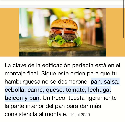 Read moreComida muy mal presentada, un local de hamburguesas tiene que diferenciarse del resto por su sabor y presentación, lo cual claramente se nota que hace falta en este lugar . yo y mis amigos pedimos 2 hamburguesas, 1 costillar y un par de cervezas. Las costillas bastante aceptable. Los vasos de agua bastante ricos también. Con la hamburguesas es verdad que se nota que les falta amor a la preparación. La carne, sin sazonar el queso sin sabor, la lechuga súper húmeda, y un pan de miga muy muy fina. por lo cual apenas empezamos a comer se desmoronaban por la humedad de la lechuga entonces decidimos comernos solo el relleno porque el pan está muy malo y pues la carne al tener poco sabor realmente no daba gusto comerla, pero el hambre nos ganó . Le hemos pedido a la Mesonera hablar con alguien para dar nuestras recomendaciones y nos han dejado en la mesa aproximadamente 15 minutos sin decirnos nada . no es la primera vez que vengo acá y siempre me he quejado por las hamburguesas pero esta vez se han pasado con la mala presentación. Y ya que no me quieren escuchar aquí les dejo una recomendación y en YouTube también tienen muchas recetas...