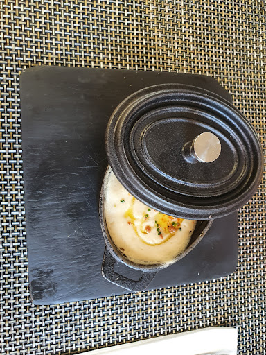 De primero probé el cocido en texturas y la foccacia de pato con salmorejo y feta. El cocido me sorprendió bastante ya que tenía texturas de mousse con sabor a cocido y te ibas encontrando trozos de garbanzos, carne, chorizo... muy bueno. La foccacia también estaba buena, el pato era muy parecido al jamón serrano. De segundo probamos casi todas las croquetas, las que más me gustaron fueron las de queso de cabra con pimientos y las de rabo, las q menos las de mar. Las de chipiron negro y ali oli también estaban buenas. Seguimos con huevo poché trufado con cebolla compotado, no estaba mal pero el huevo se les pasó demasiado, era más duro que poché y de ahí el fallo. Este plato me lo recomendó una amiga y me decepcionó bastante. También probamos las alcachofas con mermelada de pimiento, no me dijeron nada...bastante insípidas. Para terminar con lo salado pedimos lingote de cochinillo el cual estaba bueno pero quizá un pelín seco, le faltaba más salsa. Y también tomamos el rabo de toro con queso camembert, bueniiiisimo, de los platos que más nos gustaron. Finalmente de postre tomamos tarta de queso, la textura muy similar al cocido, como una mousse, estaba bueno y un combinado de mango, coco y fruta de la pasión, este me gustó algo menos.