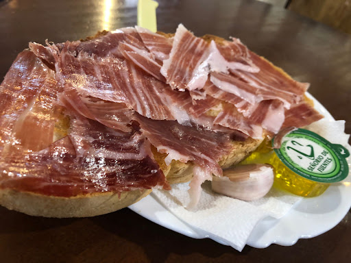 Tostadas de jamón con pan de pueblo que quitan el "sentido". Las especialidades son los desayunos, al mediodía los montaditos y las copitas.. la camarera que lo regenta muy agradable y simpática!! Justo enfrente está la placita donde venden las cosas típicas del pueblo, quesos, dátiles, pasas, ciruelas pasas, higos, castañas asadas etc.. etc... Visita obligada si visitas Fuenteheridos. Noticia importante: han abierto una churrería pero ya no podía más 😂🤣😂🤣😂🤣😂 en la próxima visita probaré los churritos. He vuelto y tras una larga espera he probado los churritos, muy buenos, pero debido al puente más de 25 minutos de espera para el chocolate y los churritos... El mejor bar para tomar la copita SIN DUDA ALGUNA de todo Fuenteheridos Bar la Esquinita tanto por ubicación como por buen servicio. Por cierto quédense con este número de lotería de Navidad porque...