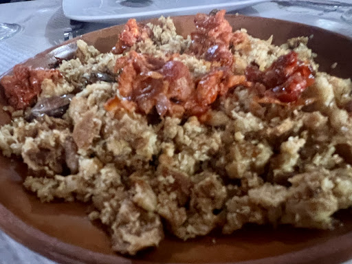 Read moreSitio muy acogedor en pleno centro del pueblo. Tiene mucho encanto su salón y la parte del bar con la chimenea. Nos atendieron rápido (solo había otra mesa) y comimos bastante bien. Las migas estaban muy ricas aunque es cierto que esperábamos un plato más grande ya que preguntamos si estaba bien de cantidad para compartir (éramos 4) y eran como media ración. La carne tb estaba bien y todo lo demás que pedimos de guisos tb, la carrillera es verdad que tenía especie de cabrillas (no estaba guisada con el típico tinto) pero estaba rica, diferente . Lo mejor los postres, la tarta de queso casera con dulce de membrillo casero estaba riquísima, súper ligera y nada...