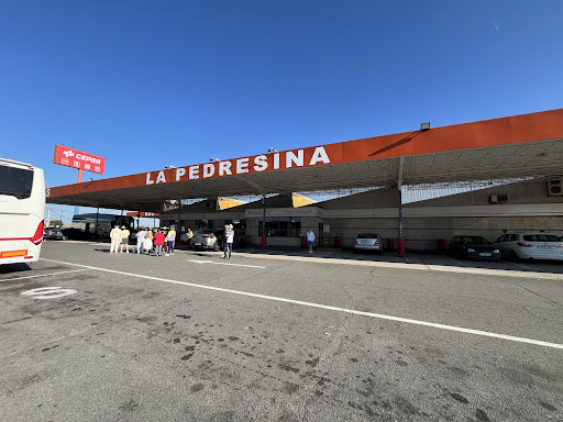 Apeadero de autocares y viajeros, que en esta estación de servicio encuentras lo que buscas o necesitas, aunque sea sólo utilizar el baño o comerte el bocadillo sentado en un bordillo, porque encontré que faltaba una zona de recreo a la sombra.