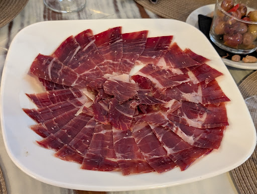En cuanto a la comida, cada plato que pedimos fue un acierto, pero hay que destacar, sin duda, las chuletillas de cordero, que estaban simplemente exquisitas, tiernas y llenas de sabor. También disfrutamos de un delicioso jamón de bellota, unas aceitunas muy sabrosas, unos calamares correctamente preparados y una milhoja de codillo bien elaborada, aunque su sabor quedó eclipsado por la excelencia de las chuletillas.