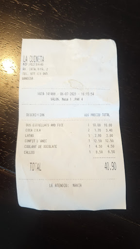 Hemos paramos a comer aqui de casualidad estando de vacaciones... buscábamos un restaurante llamado sibarites en gandesa y estaba cerrado. En su defecto comimos en este la cuineta que estaba cerca y la verdad es una loteria ...mi mujer a pedido un plato de anec confitat amb guarnicio y parecía que lo había echo la iaia y que estuviéramos en un rest caro algo increíble siendo un bar pero tremendo, yo pedí callos de ternera y patatas con foie huevos y jamón, los callos estaban malos avinagrados y las patatas sin sabor a nada mas que a pimienta roja ...(foie inexistente jamón malisimo) .. y para rematar me dice la camarera muy atenta no te a gustado...en fin le e dicho que estaban malos y su solución a sido no cobrarme el postre ...y hablando de postre ponía crema de iogurt natural con mermelada de fresa! Osea un iogurt natural con sirope de fresa! No volvería jamas menos mal que a mi mujer le a encantado el pato sino ya apaga y vamonos...y encima carito 40...