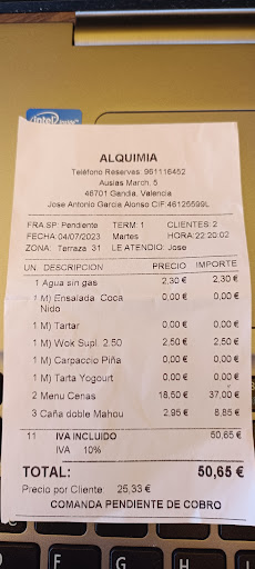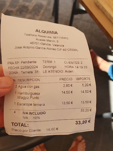 Read moreSometimes service is the difference between a 4 and a 5 star review. The food here was very good. But what really made the difference was that the staff at Alquimia was willing to serve us a few minutes after 330pm when 4 other nearby restaurants would not. Always important to know the customs of where you are and in most places in Spain, 330 is a hard stop for lunch. So, our gratitude to the staff for being so nice and accommodating, especially on a day when they have no evening service. The curry chicken was quite good as was the creamed...