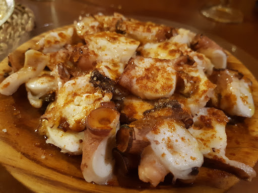 Pulpo frito. Siempre quise hacerlo en casa y me lo encontré en la carta. El pulpo sabrosisimo y la gelatina de las patas se fundía en la boca.