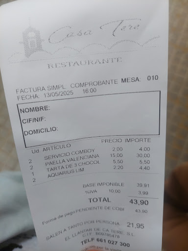 Comimos en Casa Tere y fue una experiencia que supera las expectativas. Aunque ofrecen un menú diario muy completo (4 entrantes, 4 tipos de arroces, bebida y postre por 25 €), nosotros optamos por comer a la carta.