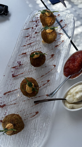 Design restaurant above the fish market with beautiful views of the moored boats. Fresh local product purchased from fishermen directly. The desserts are spectacular. Service quite correct and friendly. It is not cheap and if you do not want to spend a lot, control the prices and especially the drink, or better ask for the tasting menu. We ordered a brand of wine, and as they did not have any, the waiter came with another brand, saying that it was similar and that he left it at the same price. Finally on the bill it was wrong, there were three bottles of wine, when we had taken two. We say it, and they discount a bottle of wine, but the one that we had been offered to replace the one we had originally ordered, its price was not what we were told, but higher. More than € 200 bill and charged...