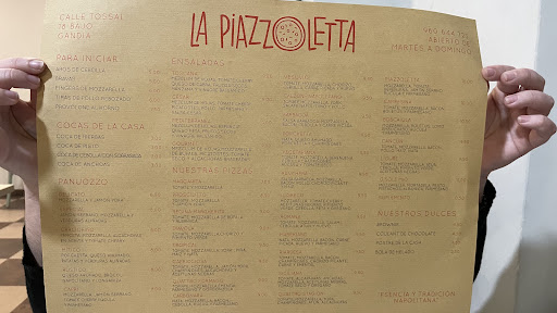 Después de mucho tiempo queriendo ir a este restaurante, por fin pude ir. Recomendado por un Milanés, me comentó que las mejores pizzas de Gandía se hacen aquí a manos de Luca. Reservamos una mesa para cenar, al llegar allí vi que el restaurante La Piazzoletta no tiene sala interior, simplemente tiene una terraza en la calle peatonal, pero no sé qué tipo de fusión han hecho con el bar de al lado y utilizan las dos empresas la misma sala. Nos sentamos en la mesa y inmediatamente nos tomaron nota de la bebida. La carta la tienes en el "mantel" tanto como de la Piazzoletta como de Bocanada. Pero en este caso nos vamos a centrar en La Piazzoletta. Tienen una carta variada pero sinceramente me decepciona que este tipo de restaurantes se adapten a nuestra típica comida. Tienes de entrantes Bravas, Aros de cebolla, finguers... Lo único italiano que vi era el provolone. Yo quitaría este tipo de entrantes y pondría comida típica italiana (Sugerencia). Seguimos con las cocas de la casa, que no tuve oportunidad de probar pero estoy seguro que volvere para probarlas. El Panuozzo, esto si es típico italiano, consiste en un Panini con masa de pizza, preparado como un bocadillo, también pendiente de probar. Las ensaladas no tenían mala pinta, pero me faltó una buena ensalada de Burrata para probar, o mozzarella fresca, al ver que las ensaladas eran muy típicas de España, decidí no pedir ninguna. Por último tenemos las pizzas, que aquí sí que te puedes volver loco por saber cuál elegir. Tienen mucha variedad e incluso la puedes preparar tu mismo. Si que me faltó ver algún ingrediente italiano, como el speck o algún embutido italiano. Pero aún así me gustó leer todas ellas. Decidimos pedir una Piazzoletta, una Capricciosa y cree una Margherita con salchicha y scamorza. En cuestión de 15' ya teníamos las pizzas en la mesa. Tenían una pintaza espectacular. La masa típica napolitana, muy sabrosa, esponjosa por la base y con bordes más crujientes, fue un orgasmo para mi boca. Los ingredientes frescos y la mezcla de todos ellos era espectacular. Me quedé encantado con las pizzas. Sinceramente una de las mejores pero tengo otra pizzería italiana en Gandía dónde la pizza está muy a la par con esta. No voy a despreciar las pizzas de Luca, me encantaron y sinceramente volveré. Después de comernos las tres pizzas, vimos los postres pero nos reservamos, para tener la excusa de volver. Al salir de allí me dirigí a la cocina para agradecer el trabajo de Luca y saludarlo. Si queréis comer buenas pizzas, no dudéis en ir a la Piazzoletta. Podéis comer allí o recoger las pizzas para casa. 100% recomendado....