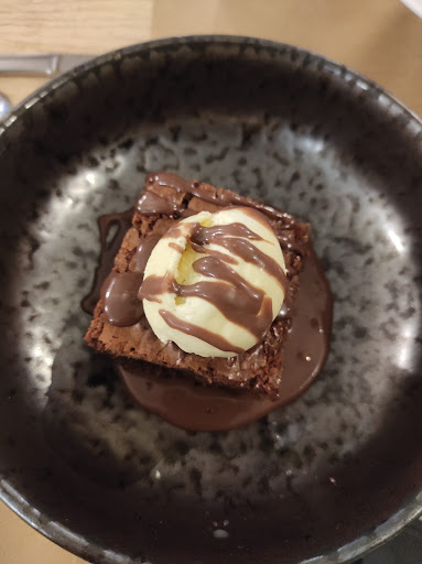 Y para rematar, los postres caseros, que fueron la guinda perfecta. Probamos el brownie con helado de vainilla, que venía acompañado de dulce de leche y estaba buenísimo, tierno y con el chocolate bien fundido. Pero la gran sorpresa fue la tarta de calabaza con chocolate por encima: jugosa, sabrosa, con un equilibrio ideal entre dulzor y sabor especiado. Un postre diferente que nos encantó.