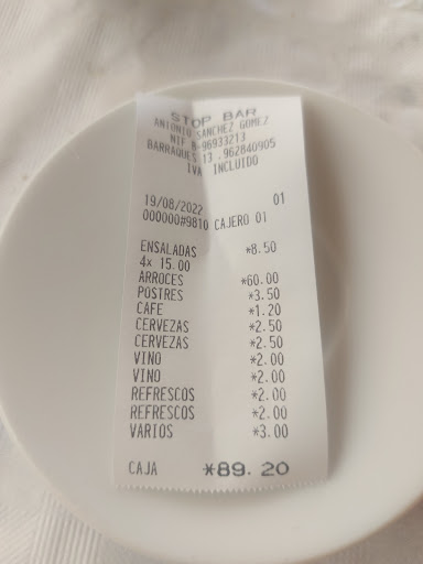 Durante la cena, un comensal en una mesa cercana nos comentó que los arroces y fideuás del Restaurante Stop son de primer nivel. Nos dijo que, aunque no habíamos pedido ninguno en esta ocasión, son platos que no debemos perdernos en nuestra próxima visita, ya que son conocidos por ser algunos de los mejores de la zona.