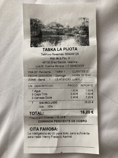 Read moreFuimos por recomendación y acertamos de pleno. Taska La Pijota no es el típico sitio de turistas: es un local auténtico, lleno de gente de la zona, con tapas y raciones caseras, sabrosas y a muy buen precio.