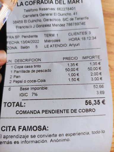 Read moreBuenas tardes, acabo de almorzar con unos familiares en dicho restaurante, previa solicitud de mesa para la una y media, hasta ahí todo perfecto, éramos 6 adultos y una niña de 4 años. Fue llegar y sentarnos en la mesa que nos habían reservado, hasta ahí, todo bien. El día está de mucho brizaje y en el lugar reservado era muy molesto comer con tanto aire. Solicitamos al dueño, encargado o camarero, una silla para sentar a la niña y nos dijo que no podía ser porque no se lo habíamos dicho, pretendía que la madre comiera con la niña sentada en sus rodillas, después de un intercambio de palabras nos trajo una trona. Entonces le dijimos la comida que queríamos y debido al fuerte brizaje le pedimos por favor si nos podía cambiar de mesa, y nos comunica que no, que esa es la que tenía reservada para nosotros y que el resto estaban reservadas y que por lo tanto esa era nuestra mesa, que sobre las 2,30 tenía unas reservas de 22 personas y que lo sentía mucho. A continuación solicitamos lo que íbamos a comer y a la media hora entran varias personas que ocuparon mesa delante nuestra y detrás, en una mesa había 5 o 6 personas y en la otra 5 y a los 5 minutos de estar sentados solicitaron el cambio de mesa, que a ellos si se les concedió y a continuación a la otra mesa también. A todo esto y para no generar mal rollo con mis familiares, comimos lo que habíamos solicitado, y para desgracia, cuando las cosas no salen bien, la comida malísima, no solo el primer plato, sin los tres que solicitamos, revuelto de gambas, chipirones, y arroz caldoso, todos los platos desabridos sin gusto y mal cocinados. En el momento de pagar, le di las gracias al señor, por el cambio de mesa y le dije que se fijará en mi cara, que más nunca me verá en su negocio. Y una de las cosas más desagradables el lo mal educado que es y el poco tacto que según mi opinión tiene con...