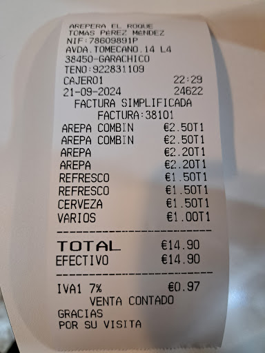 Read moreEn mi opinión, como venezolano que también soy, es que esta gente no ha visto una arepa ni de lejos. Las arepas son muy pequeñas, las sirven muy pasadas de fuego, y fritas en un aceite, que a saber cuanto tiempo hacen que no lo cambian. Saben a fritanga. Del relleno mejor ni hablar. Hay que ponerse una toalla sobre las piernas, si no te quieres poner perdido, de lo que chorrean. Son lentos, la simpatía, en el trato con el cliente, brilla por su ausencia, la cerveza esta caliente, no venden tabaco, la clientela fija es muy ruidosa, las sillas de la terraza son incómodas, el personal de cocina, no utiliza guantes, ni gorro, y los precios caros, para el servicio que prestan y la calidad de los productos...en definitiva, un autentico desastre. Lo único bueno, la ubicación. Volveremos por Garachico, un pueblo precioso e increíble, pero por esta "arepera", no volveremos mas, y desde luego que tampoco se la...