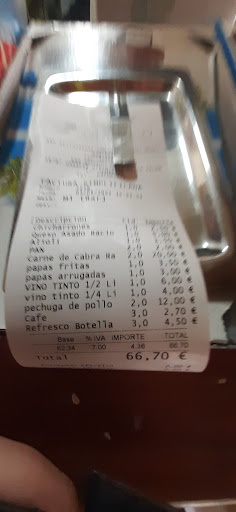 Read more4 adultos, 1 de queso asado con mojo, 1 de chicharrones, 1 de carne cabra para 2, 2 de pechuga de pollo, 1 de papas fritas, 1 boniato frito, 0.5L + 1/4L de vino de la zona, 3 refrescos, agua, 3 cafés y un licor. Todo muy, muy bueno y cantidades abundantes. Queso de la zona grueso y buen mojo verde, carbe cabra muy limpia y con bastante carne, pechugas de pollo grandes a la plancha con curry (no lo pone en la carta) acompañamiento ensalada de lechuga, millo, tomate, cebolla, pepino y aguacate, plato contundente y muy rico. Papas fritas y boniato natural, mo congelado, buenas raciones. La carne cabra para 2 personas 20€, cada plato de pollo con ensalada 6€, ración de papas fritas 3€, ración de boniatos fritos 3.5€. Adjunto fotos, la de la cuenta no se ve muy bien. Atención espectacular, atentos, serviciales y siempre con una sonrisa a pesar de que se llenó y había mucha gente esperando. Lugar amplio, tranquilo, con zona de acampada para casetas y carabanas, información en el restaurante. Vayan temprano, suelen ir guaguas de turistas y se llena. Tiene terraza e interior. Lo recomiendoal 100%, sorpresa muy buena, estaba todo cerrado y terminamos ahí....