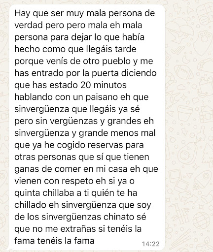 Perdona que te diga pero aquí el único que se ha puesto a insultar, además por un número privado a nuestro Whatsapp (foto que he adjuntado) has sido tú, llamandonos sinvergüenzas múltiples veces. Después, puedes leer mi reseña y ver que en ningún momento te he llamado cateto, sinó que has actuado de aquella manera, lo que comprendas tú es otra cosa, haztelo mirar. Que trates así a unos clientes es lo que habla por si solo de tu "restaurante". Ja veig que saps utilitzar el traductor i respondre en català, però no fa falta de veritat, ja estic acostumat a tractar a gent com tú. I ara que saps utilitzar el traductor al català, utilitza el corrector pel castellà, que només cal veure el missatge per saber-ho. A mes, ningú ha rigut de la cambrera, altre invenció teva. Si tan ocupan estaves a les 14:22 amb més clients no hauries fet la contestació.