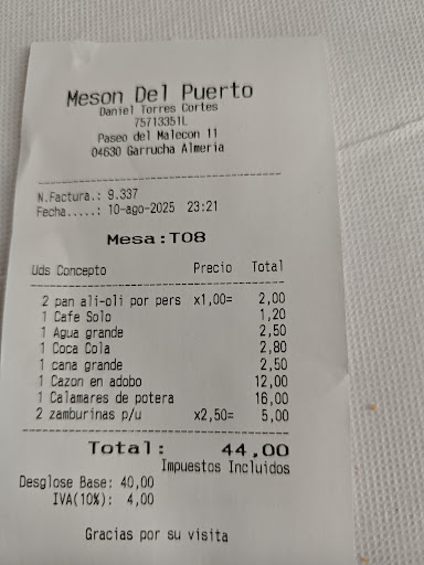 Buenísimo restaurante!! Sin duda de lo mejor de Garrucha. Desde fuera llama la atención la gran terraza por la buena decoración,el mobiliario moderno y la iluminación nocturna. Da aspecto de que va a ser mucho más caro que las terrazas de la zona y nada más lejos de la realidad. Fuimos a cenar 2 adultos y un niño y quedamos encantados. Es un restaurante familiar,tanto la madre como los 2 camareros que nos atendieron fueron cercanos y muy amables. Nos pusieron unas rebanadas de pan recién tostado con un cuenco de Ali-oli. He de decir que no somos muy fan del ali-oli pero de este no dejamos ni un poco. Estaba muy suave y con un sabor que no repite (la madre nos explicó que lo hacían sin huevo y era una receta casera). Pedimos 2 zamburiñas buenísimas y con muy buen tamaño,con un toque justo de especias. Seguimos con una ración de calamares de potera y una ración de cazón en adobo. Los calamares estaban exquisitos,se nota el sabor cuando el producto es de calidad. El cazón es otra delicia también con un toque de especias que lo diferencia de los típicos que te suelen poner. Ninguna de las raciones estaba grasienta,se notaba el buen cuidado del producto en cocina. A destacar el detalle que tuvieron cuando pedimos unas patatas fritas para el niño y nos pusieron un plato de patatas fritas ,hechas de patata de verdad,y no nos lo cobraron. Que te pongan patatas fritas que no sean congeladas ya es un logro hoy en día en cualquier sitio,pero que encima no te las cobren ya que eran para un niño pequeño demuestra el ambiente cercano y familiar del restaurante. En las mesas cercanas se notaba que había clientes habituales por las conversaciones que mantenían con los camareros. Al despedirnos no se cuántas veces nos agradecieron la visita y nos explicaron los nuevos platos que habían ido incorporando a lo largo del tiempo. Cuando vuelva a Garrucha sin duda les volveré a visitar. Adjunto foto del ticket donde se ve que los precios no son nada caros y la calidad es muy superior a los bares de la zona. Lo recomiendo...