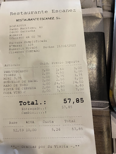Read moreCalidad media/baja a precios no acordes. Se puede pagar lo que cobran, no me parecería mal, si pusiesen calidad... una pena por que me han dicho que hace años era uno de los mejores, o el mejor de la zona. Y al pedir gambas, en la carta ponen precio de la ración, se entiende así ya que no ponen el peso, y luego te traen la cuenta con el precio por kilo, que por cierto deciden ellos, ya que no te preguntan cuántas unidades quieres o en peso. En fin, mal camino, ya que hay sitios como 4 Nudos en San José que es top, top, o Terraza Carmona en Vera que igual comida de 10 y trato igual. SEGUNDA PARTE: De verdad que la crítica podía haber sido mucho peor, pero me quedo aquí, por que no tengo nada personal en contra. Pueden ver los sitios que frecuento entre los que se encuentran desde 1, 2, 3 estrellas Michelin hasta bares y cafeterías, por lo que sé de verdad lo que digo de la calidad/precio, sobre todo cuando locales a su lado tienen una calidad/precio como mínimo para hacerles reflexionar, sólo pretendía hacerles ver que es una pena el camino. Respecto a la ración o peso no es así. En la carta pone Gamba Roja de Garrucha 24€, nos trajeron la ración y nos cobraron 24€, en el Gambón Rojo de Garrucha de 28€ la ración, si son 28€ la ración y yo no pedí ningún cambio de donde salen los 35€ de la cuenta???? De todos modos se equivoca, la calidad es totalmente subjetiva, no objetiva. Depende lo que estés acostumbrado te parece una cosa u otra. Quizás deberían probar 4 nudos, Terraza Carmona, Oro y Luz, Tony García Espacio gastronómico, etc... en esta semana hemos hecho un tour gastronómico y de verdad que estamos encantados con el nivel de restaurantes y de producto de Almería, pero no es su caso, y repito, no es personal. Un...