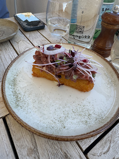 We were served some lovely olives and generally food service was fast. Something that important to us and rare in Spain 🤦🏻♀️ First thing notice is that every plate was absolutely beautifully presented (see pictures). But this may annoy some as you have to forage through the decoration to get to the plate. I’d say the portion sizes were on the smaller side (very French). My husband and I shared every plate and was most impressed by the fish. All the other plates (for us) had something it could have done without (mostly the garnish).