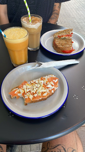Me tome un batido de zumo de naranja fresa y plátano riquisimo con fruta recién exprimida y con gran sabor. Para acompañarlo me comí una tostada de pan de semillas brutal pasado x la plancha con queso y salmón riquisimo con unas pocas semillas de chia.