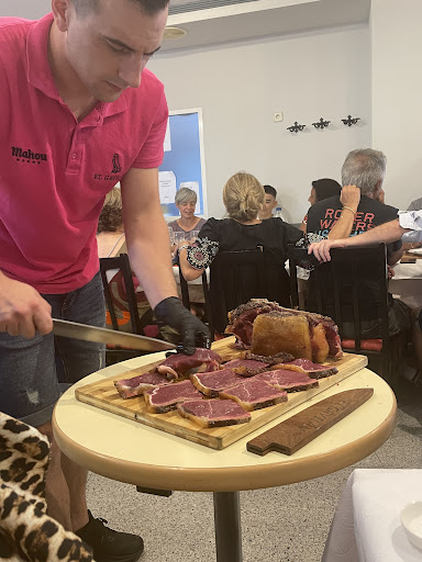 Read moreHemos tenido una comida familiar. La carta es bastante amplia y tiene todo una pinta increíble.Para amenizar la espera nos trajeron unos choricillos en un cántaro y un aceite de oliva con sabor a huevo frito con un paté y panecillos. Pedimos ensalada de tomate y perdiz al centro junto con bolitas de calamar en su tinta, el sabor del tomate espectacular, y las bolitas con ali oli que le daban un toque súper rico. Luego pedimos para compartir carne ibérica madurada 30 días para hacerla con una plancha al centro y otro comensal unas chuletillas de cordero. De postre la tarta de queso que la porción es muy generosa y bolas de helado de vainilla, para compartir. Cafés y varios chupitos. Además no te puedes perder el show que montan los camareros al cortar la carne y con el postre de chocolate. Hemos acabado encantados. Totalmente recomendable. Recomendaremos y...