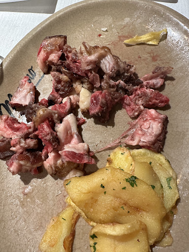 Read moreUn sitio q deja mucho q desear…. Hemos visitado para cenar la Marisquería Moreno en Getafe que llevábamos tiempo queriendo ir y lo hicimos como plan familiar. Aparentemente es un sitio muy amplio y tiene buena imagen pero el trato y los platos deja mucho q desear. Al menos en la zona dl restaurante q x cierto además d ser un mismo sitio tiene dos zonas donde sirven platos diferentes pero si de casualidad te apetece pedir puntualmente uno q haya en el otro restaurante pues no te lo permiten (primer punto negativo). Al subir a la zona de restaurante y preguntar sobre los platos el señor q nos atendió parecía q no tenía un buen día y la explicación q dio fue bastante escasa y poco agradable (teniendo en cuenta q m voy a gastar mi pasta ahí y solo necesitaba información) No obstante intentamos darle una oportunidad (intento fallido ya q los platos q pedimos además de caros no estaban bien servidos y tenían mala calidad), se lo comentamos al señor mal humorado y su respuesta fue bastante desagradable. Pedimos anillas d calamar, croquetas, Pulpo Moreno y Chuletón. Estos dos últimos no estaban buenos, ni la preparación dl plato y el corte. El pulpo de 22€ apenas se apreciaba el sabor xq lleno d grasa y troceado tan pequeño q casi ni se disfrutaba. El chuletón de 26€ era mitad grasa y mitad carne. Muy caros estos dos platos para lo q ofrecen. Total, q no nos apeteció ni pedir postre por temor a seguir pagando cosas caras y de mala calidad. Es una lástima realmente, salimos muy descontentos y la atención pésima. (Adjunto imagen del pulpo y d toda la grasa q sobró...