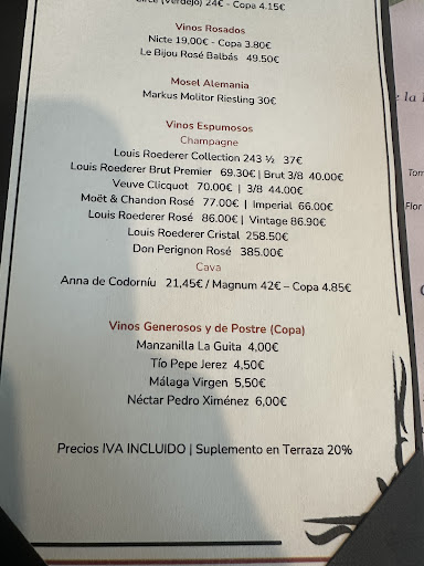 Gracias RESEÑA ORIGINAL Bar de impresentables. Voy con mi mujer e hijo a celebrar nuestro aniversario. Pedimos un vino de la carta que nos ofrecen y que cuesta 258’50 ( adjunto foto) Cuando nos lo traen, nos dicen que si lo queremos cuesta 310€. Según ellos la carta está mal. Se han salvado de la llamada a la policía porque iba con un niño pequeño y con hambre. Jamás me ha pasado algo así en ningún restaurante. Después de poner la reclamación pertinente, nos hemos marchado. Una vergüenza de sitio y de propietario, estaba presente . Hay que huir de este...
