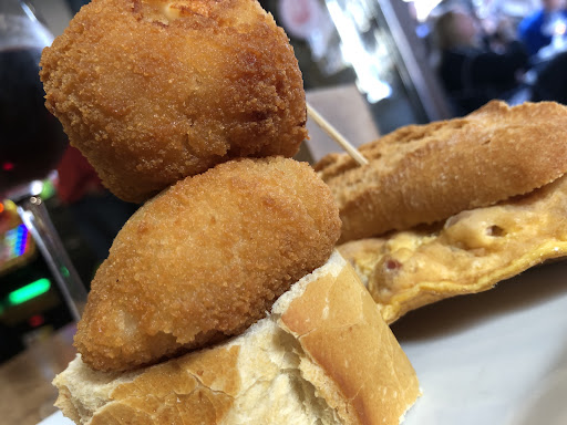 Read moreHemos ido en jueves, cuando todo lo demás estaba cerrado, no había mucha gente, los pintxos serían los sobrantes de la mañana y no estaban demasiado bien de punto. Los pintxos fritos nada crujientes y grasientos, pero todos buen sabor y buen género. Los de jamón con paté muy ricos. Íbamos sin muchísima hambre, así que no echamos de menos que hubiera poca variedad de pintxos. Lo que no consigo entender es por qué la camarera, cuando aún seguíamos pudiendo pedir alguno más, se puso a recoger todos los platos de la barra, sin preguntarnos si íbamos a querer más (no eran ni las 22.00 de la noche). Alguna Gilda más o alguna croqueta nos habríamos pedido, que ambas estaban bastante buenas, pero debe ser que la mujer que estaba en la barra no quería vender más.