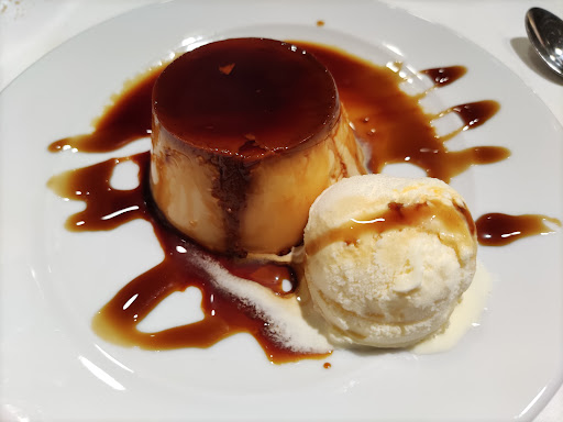 Lo más pobre quizás los postres, por su escasa opción de elección. Me apunté al típico flan. Un flan con una bola de helado de vainilla. Rico, sin más.