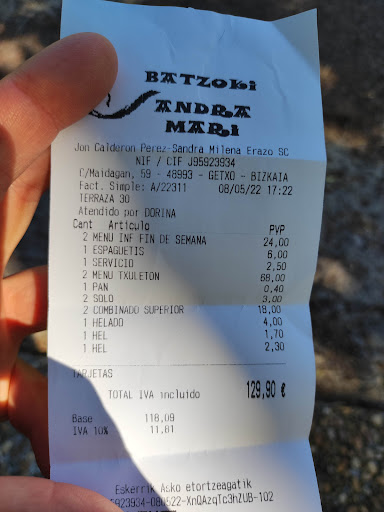 Read moreBastante caro para un menú del día + café (18'30€). La comida: de las 3 opciones que tenían de primero, uno no había. Pedimos alubias por descarte, estaban ricas de sabor pero algo duras, nos dieron un currusco de pan insignificante, pedimos más pan y nos dieron otro pedacito igual. Pedimos unas guindillas para acompañar a las alubias y nos dijeron que no había (llámame incrédulo pero estoy más cerca de creer que en un batzoki y vendiendo gildas todos los días, diría que no te da la gana de abrir un bote). De segundo un cacho de carne que llamaban entrecôte, el cual no nos preguntaron como lo queríamos de cocción y nos lo sirvieron como si de una zapatilla se tratase, las patatas fritas bastante bien. Servicio: la mesa estaba medio mal puesta, nos trajeron la comida, no teníamos ni pan, ni servilletas, ni bebida, ni cubiertos al completo. El postre: un brownie de 1cm x 1cm, podrían dar de comer a todo Algorta con ese tamaño de ración. Por decir algo positivo el café estaba bueno (1'60€ por un cortado) La sorpresa: Al pagar, 16'20€ del menú+ 1'60€ del cortado + 0'50€ del currusco de pan que pedimos aparte que era de risa. Me podría comer 5 cachos de pan como ese antes de empezar a comer, una vergüenza. En resumen: 18'30€ por un menú del día con raciones pequeñas y un servicio bastante malo, no vuelvo ni aunque...