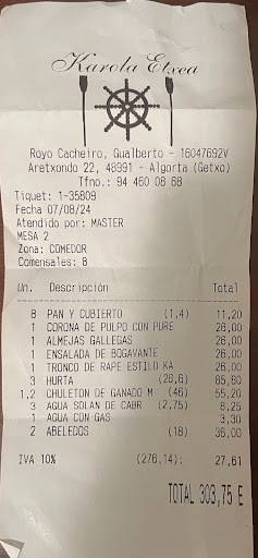 Read moreLAMENTABLE. Hemos ido 8 personas a comer y la experiencia no ha podido ser mas lamentable. Dos de los comensales han pedido calamares en su tinta y en uno de los platos hemos encontrado varios pelos largos. Lo hemos puesto en conocimiento del servicio y pedido que nos los retirasen. Todavía estamos esperando algun tipo de disculpas por habernos "estropeado" la comida familiar. Nos han dejado acabar el segundo plato al resto sin dirigirse a nosotros en ningún momento (20-25 minutos sin dirigirse a nosotros) y al final nos han ofrecido algun otro plato sustitutivo a lo que hemos dicho que no. Hemos dado por concluida la comida porque nos queríamos marchar cuanto antes y no ibamos a consumir ningun postre/café en ese restaurante. Es a la hora de traer la cuenta cuando la maitre nos dice que en la cocina le han dicho que se trataba de los "bigotes" de gamba que se habían colado en la salsa, cosa que ha empeorado todavía mas la NEFASTA GESTIÓN DE LA INCIDENCIA, porque esa explicación atenta contra nuestra inteligencia. La diferente textura, flexibilidad, curvatura, calibre, etc, etc etc, entre un pelo y el bigote de una gamba es lo suficientemente grande como para ser encima ridícula la explicación. Nos hemos marchado del local pasando a escaso 1 metro de las dos personas que nos han atendido y encima ha aflorado mas su mala educación porque no han sido capaces ni de decir adiós. No volveremos nunca a ese restaurante ni por supuesto lo recomendaremos. Me gustaría que alguna persona responsable del mismo tuviese la valentía de dar una explicación coherente a lo sucedido y que ha dado pie a esta reseña tan negativa ya que no han sido capaces de realizarlo presencialmente. Adjunto la factura. Respecto a la comida, la txuleta buena, la Urta regular (estaba un poco seca), el pulpo rico, las almejas ricas y la ensalada de bogavante malísima (inexistencia del marisco, excepto las cascaras) y parecia el plato mas una...