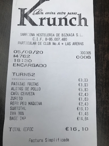 El Krunch, todo un referente, en Bizkaia, cuando hablamos de , bocadillos, hamburguesas, platos combinados etc Este en concreto, situado en Las Arenas, en la calle Particular de Club, por dónde tiene una entrada y otra por la calle Mayor , Terraza a ambos lados del local , muy amplia y recogida , la de abajo , en los soportales de la calle Mayor, ideal , para días lluviosos y muy calurosos, y otra terraza en la plaza particular de Club ,más deada y abierta . En cuento a la oferta que tiene , dispone de una carta amplia , donde puedes elegir, diferentes hamburguesas, sandwiches, bocadillos , raciones y platos combinados, ademasxde postre, como una tarta de zanahoria, muy buena .batidos de fresa, vainilla y chocolate deliciosos Yo dile coger la opción del plato combinado,de pollo empanado con ensaladas de pollo con salsa cesar , patatas y croquetas. Hay también opción de menú infantil, pollo por ejemplo con patatas y croquetas con bebida y postre ( una bola de helado) por 9 euros Hay que resaltar en este local la atención de los profesionales que están en barra, una mujer encantadora y profesional, muy amable con los niños, mayores , y trabajadora incansable , que siempre nos saluda con una sonrisa,y tambien a un chico , de barbas ( no voy a poner los nombres) encantador igualmente, amable eficaz y siempre de buen humor Para nuestra familia es un lugar de encuentro, vamos cada 14 días , a comer en familia, nosotros lo hacemos dentro , que también es una posibilidad, dada la buena distribución del sitio Gracias a todo el personal por el trato...