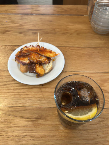 Read moreMe pedí dos pintxos de pulpo a la gallega... Riquísimos y he de decir que salió muy rentable porque cada uno costó 3€, pero quién haya comida una ración de pulpo y vea ese pintxo sabiendo a como esta el pulpo se va a dar cuenta de la suerte que ha tenido. En la foto que adjunto solo se ve uno, el otro esta debajo! Ya os digo yo que sale muy rentable. La cocacola son 2€ con algo, la caña rubia 3€ y pedí la ración de rabas de 9€ y muy ricos, aunque el frito recuerda a unas porras o churros 😂. Perfecta para dos personas o tres, no más! Por cierto si cogéis las mesas de dentro del local con ventana teneis las vistas que os dejo abajo....