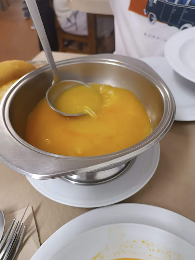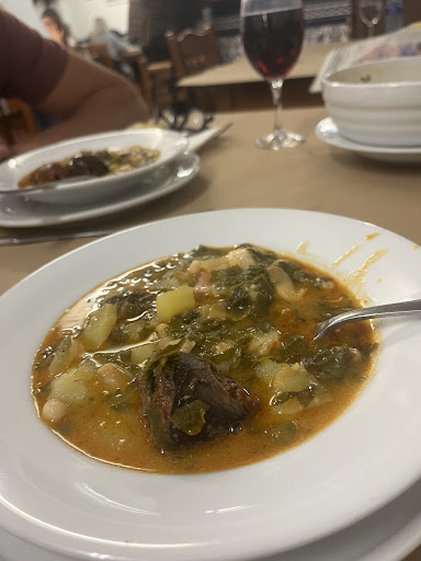 Hoy había un llamativo menú con 3 platos, bebida (vino con casera o agua) y postre, por 14€ por persona. El 2º y 3º plato es a elegir entre 3 opciones. El postre también es a elegir entre varias opciones. Nosotros hemos elegido: 1º Sopa de pescado 2º Pote asturiano 3º Jamón asado con salsa y patatas Postre: Tarta de queso casera. Bebida: Vino con casera. Te abren las 2 botellas allí para que te eches cuanto quieras y, el chico te dice, “si necesitáis más, me lo pedís”. Hoy costaba el menú 14€. Los menús los van cambiando a diario y van teniendo diferentes precios.