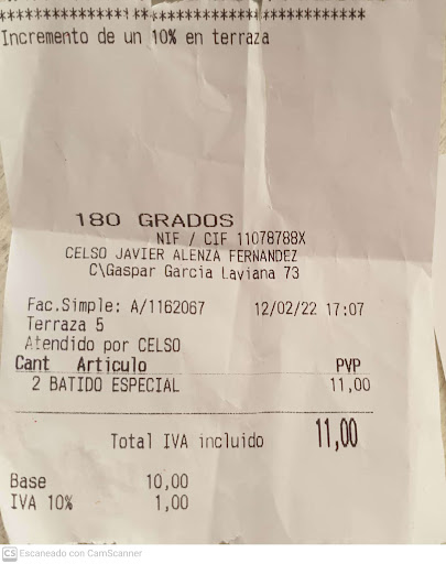Se enseña a la camarera el ticket por cuantía de 11 € por 2 batidos especiales y le explica que el viernes su madre reclamó la vuelta que se le dio incorrecta.