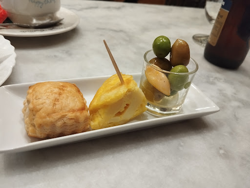 Además de esto, a la cerveza le acompañan unos pequeños pinchos salados (si no recuerdo mal uno de ellos era de tortilla)