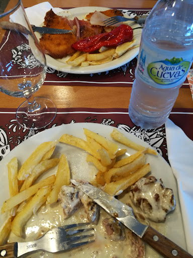 El segundo plato de solomillo con queso de Cabrales que vino aderezado por el camarero con un "espero que esto te guste más" consistía en 4 rodajas escuetas de solomillo con salsa de Cabrales por encima y patatas congeladas. Los medallones de solomillo presentaban diferentes tipos de cocción, todos con una capa quemada por encima y algunos crudos. El cachopo de pollo consistía en una loncha de jamón York con queso y dos pechugas crudas encima y debajo como se aprecia en la imagen, da la sensación de que estaban hechos de antes y se han rebozado y frito en la freidora porque el rebozado es lo único que parecía que no se había hecho una semana antes.