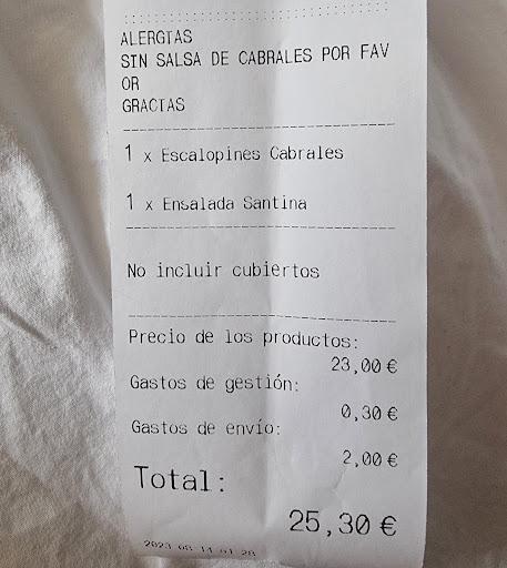 De vez en cuando pedimos comida a través de la aplicación glovo. Antes de la pandemia lo haciamos mucho más a menudo, pero iba mi padre que en paz descanse en persona a recogerlo al local. Comida rica y abundante y a un precio muy aceptable. Todo bien hasta hoy, ya no tanto por el error con la comida, que lo puede tener cualquiera, sino por las formas en que me acaba de responder la señorita por teléfono cuando se lo he comentado. Pedimos ensalada Santina y escalopines al cabrales (sin salsa de cabrales). Si, sin salsa de cabrales porque de 2 que somos en casa a mi no me gusta. Como en la aplicación no hay otra forma de reflejarlo mas que en la zona de alergias, lo escribí ahí en letras mayúsculas. Pues bien vinieron los escalopines con salsa de cabrales como si no hubiera un mañana. Digo que un error lo puede tener cualquiera porque aborrezco tirar comida y de 2 que somos 1 se lo puede comer. Y porque no sé puede crucificar a un local por un error que en mi caso es subsanable. Quise contarle esto a esa "amable" señorita; que no hacia falta que enviasen otro pedido en sustitución, pero que para la próxima vez por favor se fijasen, pero me fue imposible. En resumen: Vaya cuanto lo siento, que quiere que le mandemos otro? No no hace falta pero por favor para la próxima vez fíjense porque.... !Ya le he dicho que lo único que puedo ofrecerle son disculpas sino quiere otro! Muchas gracias no le hago perder más el tiempo. Y colgué. Colgué porque no me apetece discutir con alguien que a todas luces ni sabe ni quiere dialogar. Mire, no se puede responder de esa forma a alguien que no te está ni gritando ni levantando la voz, ni te está atacando. Y si está usted estresada lo peor que puede hacer es tratar de esa forma a los clientes, le va su futuro en...