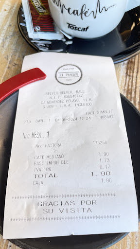 Read morePara desayunar a buen precio. Lugar de la visita: Cafetería El Pinar Fecha de la visita: 02/08/2018 Esta Cafetería ocupa un local de tamaño mediano, que además tiene mesas en el exterior conformando una pequeña terraza. Hemos desayunado cuatro cafés con leche con cuatro croissant , además de otros cuatro pequeños que vienen con los cafés, por 10,80 euros, o lo que es lo mismo, a 2,70 euros por persona, un precio muy bueno. Los cafés y los croissant estaban muy buenos. En cuanto a los aseos, me gustaría comentar que en el de los hombres hay que tener cuidado al entrar si no quieres darte un golpe en la cabeza, ya que te encuentras con un saliente de pared a la altura...
