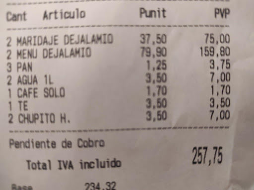Lunch for 2. We chose the Dejalamío menu, 79.90€, plus 37.50€ wine pairing option, per person, which means 117.40€ for each of us. Let me start with the positives: The food was quite good, came fast and was just enough. We chose the most expensive menu with the highest number of dishes in it, had we ordered some other menu I highly doubt the quantity would've been enough. The wine pairing was good too, interesting choices and one glass per dish (except for the 2nd dessert dish which did not include any drink for some reason...).