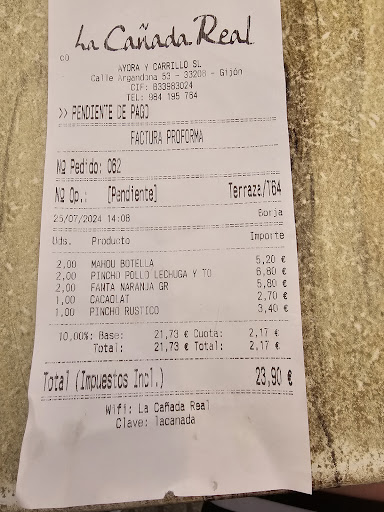 Read moreEl 28 del 6 de 2024 hacia las 6.30 más o menos nos sentamos en terraza el camarero de primeras le dice a mi esposa nena hay que esperar tengo mesas delante lo cual entendimos y esperamos pero no nos limpio la mesa que estaba llena de agua y restos de comida y demás luego de unos 15 a 20 minutos vuelve y dice ahora si pueden ordenar ante lo cual le digo que si nos podría limpiar la mesa el mismo contesto de mala manera diciendo primero me piden y luego ya les limpio la mesa ante lo cual le digo que no es la respuesta el de muy mala forma se da media vuelta y se pone a pedir a la mesa de al lado evidentemente nos levantamos y me dirijo a pedir una hoja de reclamación evidentemente señalando además quemientras estuve en terraza se levantaron dos mesas de 3 personas cada una por cansarse de esperar según escuche. Una vez que me Dan la hoja de reclamación la lleno pido me la sellen le dejo la sellada a ellos y yo saco fotos pues no me dieron sino una hoja sin copias entonces yo con la mía impresa en casa me iré al ayuntamiento ya que todo esto es raro con respecto a la hoja de reclamación luego se hacer a la persona que se encargo de esto de nombre Tamara y nos dice que total eso nunca llega a nada como en tono de burla eso lo veremos dije yo señalándo que la misma me había dicho que no tenía tiempo ni para firmar ni para sellar al final si la sello pero se negó a firmarla señores de la cañada real tomen carta en este asunto poseo además dos testigos que estaban en la barra cuyo mobil me dieron y por ser yo una persona a con discapacidad tuvieron esa empata conmigo ahora veremos lo que sucede por cierto esto también lo pondré en redes sociales es una indignación traten...