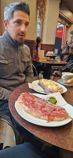 Read moreBuen local con buena ubicación, justo en la esquina de enfrente hay otro local igual, en esta ocasión me decidí por entrar en este antes de iniciar mi viaje desde la estación de autobuses ya que está justo al lado y el local estaba en ese momento casi vacío por lo que pensé que el servicio sería rápido ya que disponía de algo de tiempo antes de la salida de mi autobús, idea que al poco de sentarme ya me di cuenta que no sería así, ya que como comenté antes el local se encontraba casi vacío, eran las 9 de la mañana y viendo que había 5 personas atendiendo en barra, no esperaba tener que esperar unos 15 minutos a ser atendido, tras pasar en varias ocasiones por delante de la mesa en la que me encontraba una de las camareras, a la cual le doy los buenos dias por si era que no se había percatado que estaba alli, lo cuál dio exactamente igual ya que en ningún momento se detuvo en la mesa para ver que quería, viendo que el tiempo pasa me decido a acercarme yo a la barra a pedir mi consumición, donde me indican que ya me lo llevan a la mesa, otra vez su tiempo de espera. En resumen entras a tomarte un café y un pincho a 30min. de la salida de tu autobús y 15min. pasan hasta que la consumición llega a mí, servicio lentísimo para el personal que estaba allí trabajando y los clientes que en ese momento estaban en el local, esta situación no es la primera vez que me ocurre por lo que ya me he decidido a poner esta reseña. Tema también a tocar es la subida de precios que han ido haciendo y que ha dejado el precio del café a 1,60€!! asi que viendo lo visto y con el café a este precio(si es que con el nuevo año no hay nueva subida) pues es para pensarse bien donde ir a...